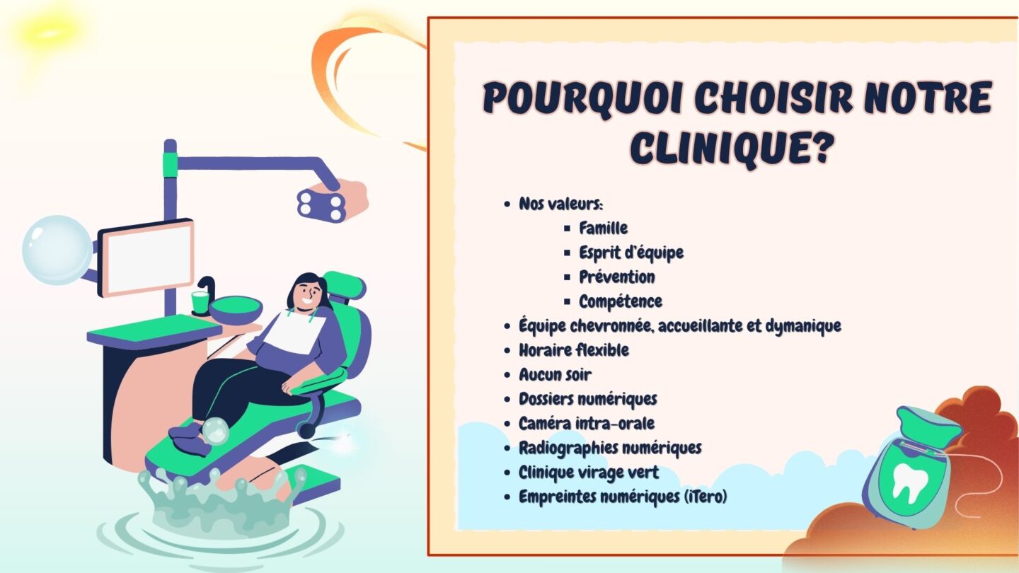 Belle clinique avec équipe dynamique qui saura vous accueillir dans un environnement sans stress. Grandes salles avec fenêtres. Ambiance chaleureuse axée sur le bien-être des patients.