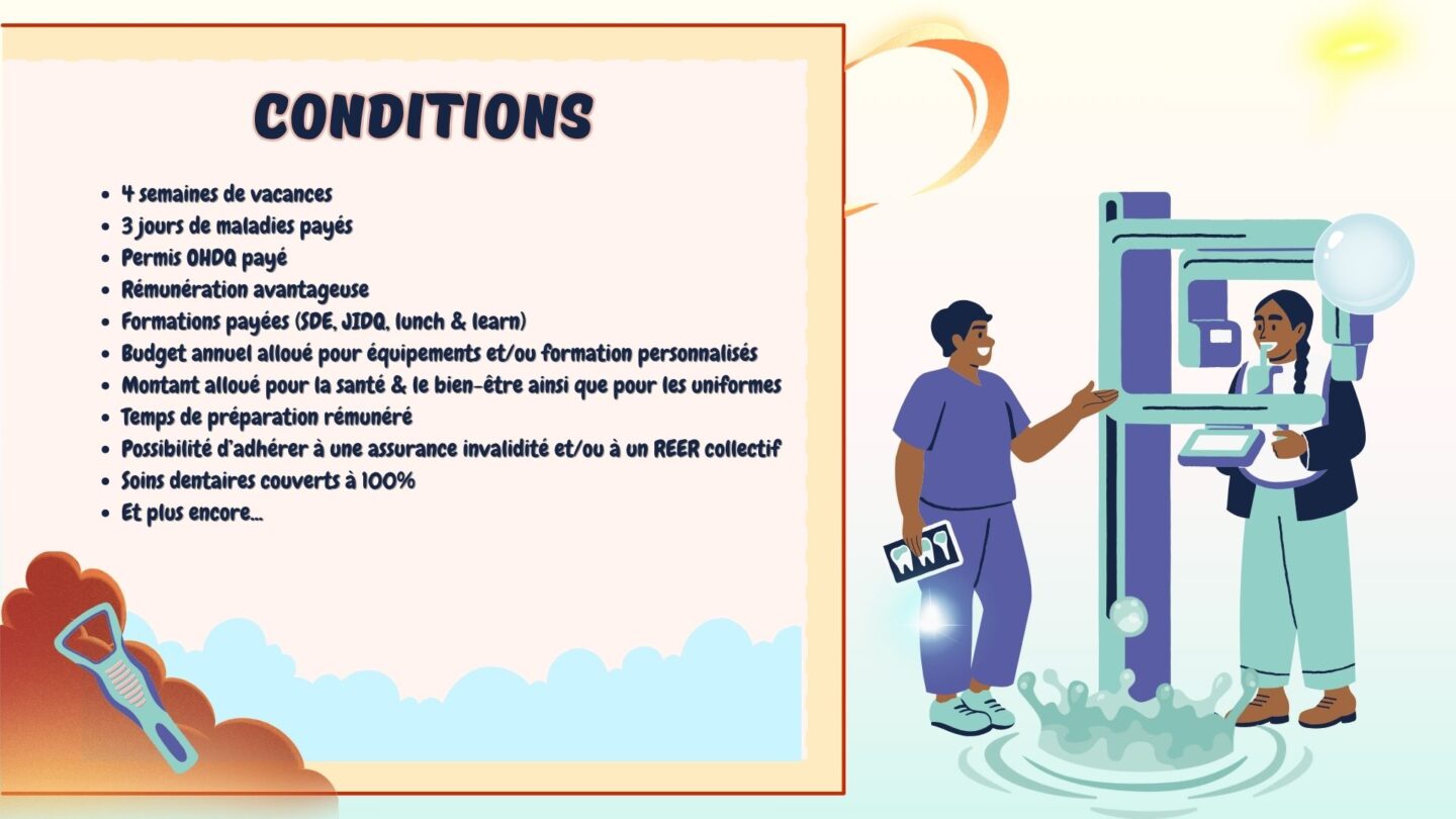Tâches traditionnelles, assistance à la chaise, stérilisation et désinfection, laboratoire, aide au secrétariat,… Si tu veux relever un nouveau défi, le poste est pour toi!